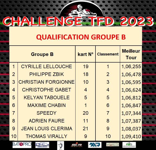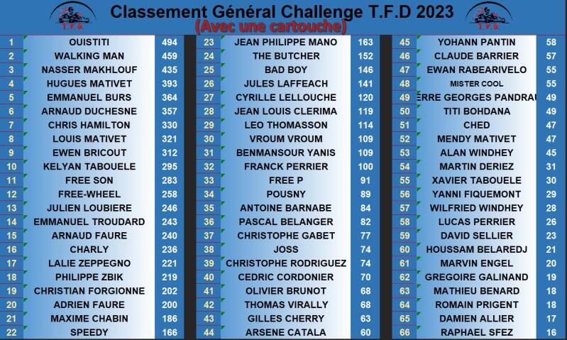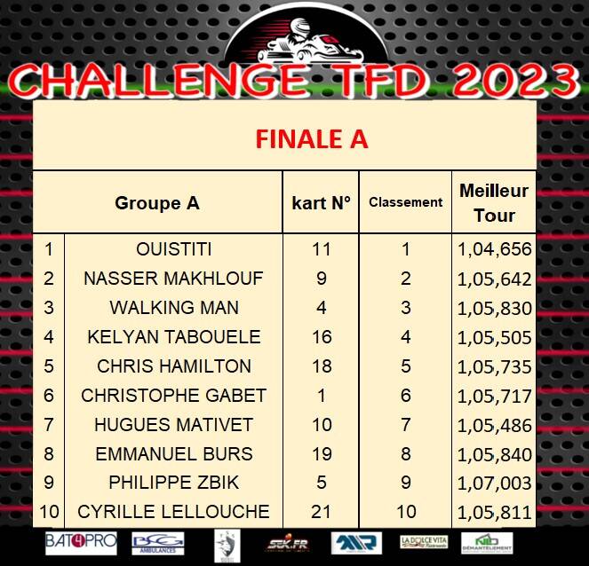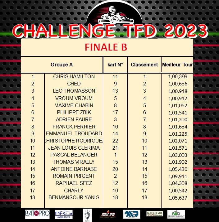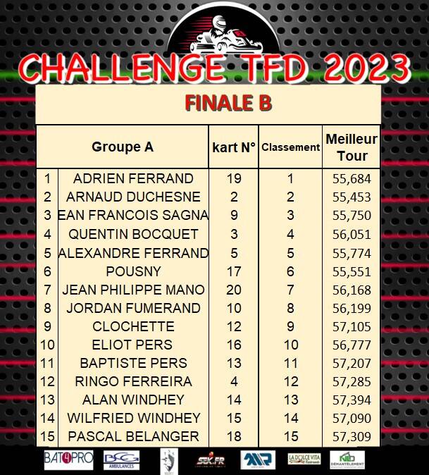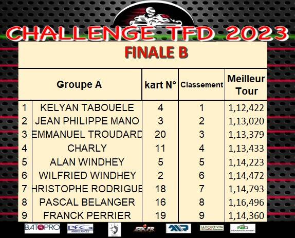 Coté résultat et sans surprise, Axel Francoeur sera le vainqueur incontesté de la Finale A, un podium complété par Thierry Engel désormais seul pilote à avoir participé à toutes les courses des challenges T.F.D et Nasser Makhlouf. La victoire en finale B reviendra à Jules Laffeach sorti vainqueur de son duel avec Ewan Rabearivelo, J.P Mano auteur d’une excellente journée prendra la 3ème place.