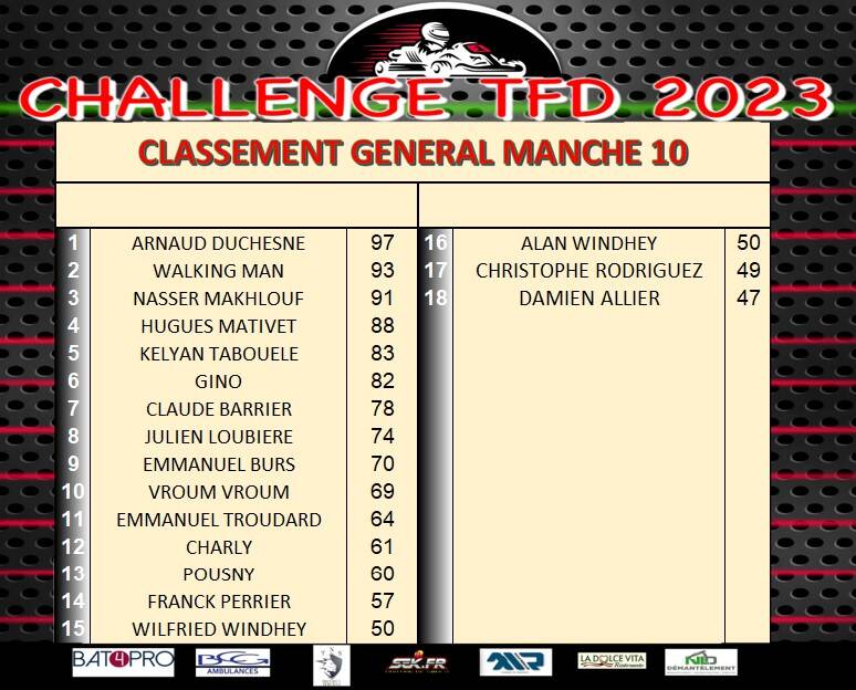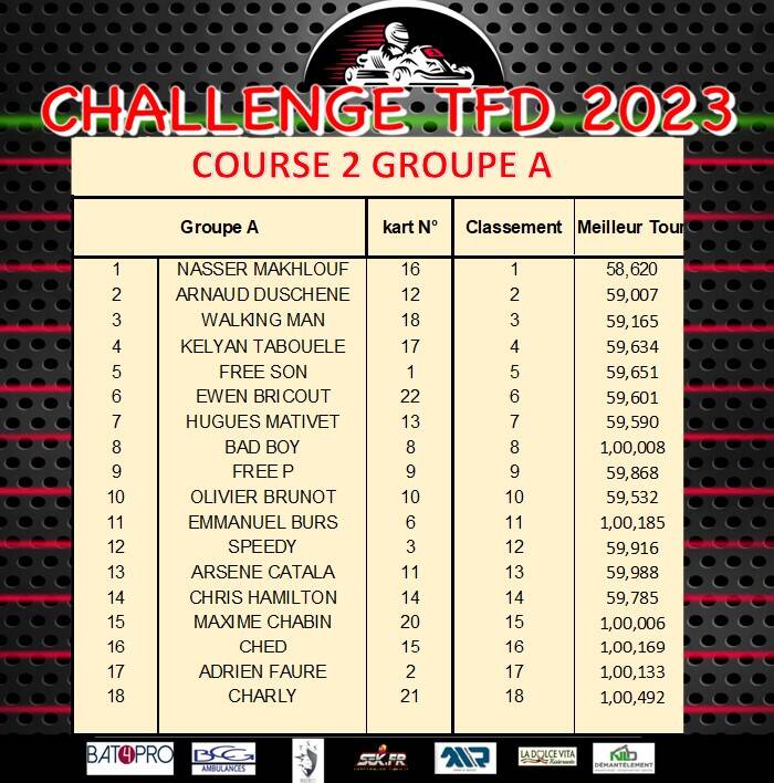 A noter, la présence de plusieurs pilotes novices, parfois jardinier ou en visite au pays des pneus lors des premières manches mais auteurs d’une finale propre et quasiment sans sortie de piste. Ils ont su comprendre et apprendre le karting 2 tps grâce aux conseils avisés d’un pilote aussi expérimenté que gentil, que nous ne nommerons pas (Free P) c’est aussi ça l’esprit du Challenge T.F.D.